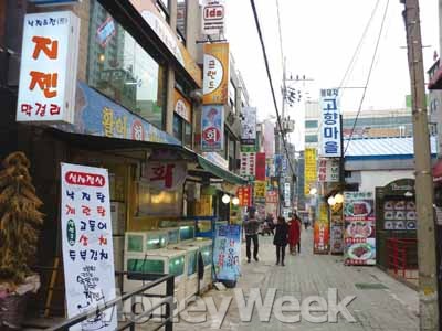 시내 중심가 뒷편의 시내 골목상권에는 막걸리집이나 순댓국, 감자탕 등 점심 식사와 더불어 저녁에 술 한잔 할 수 있는 서민적인 업종이 여전히 유효하다.