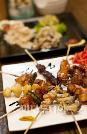 볶은 야채에 튀긴 닭다리를 넣고 양념을 더한다. 양도 적당하고, 소스가 달콤하면서 매콤해 시원한 사케와 잘 어울린다. 일본식 닭 꼬치구이‘야끼도리(1만3000원)’는 20~30년 전부터 인기를 얻은 대중적이면서 친숙한 요리이다.