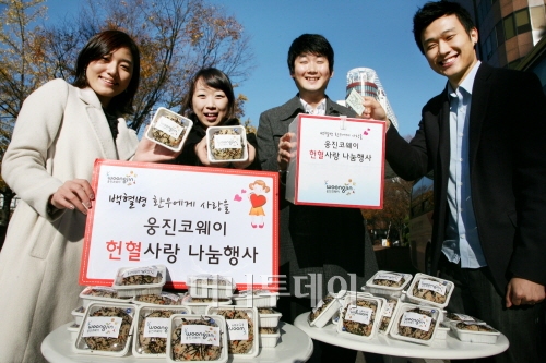 웅진코웨이(85,900원 ▲6,300 +7.91%)(사장 홍준기)는 15일 대한적십자와 함께 순화동 본사에서 사내 임직원들을 대상으로 '헌혈 사랑 나눔 행사'를 진행했다고 밝혔다. 웅진코웨이는 웅진 친환경 쌀 '유구미'로 만든 주먹밥도 이번 행사에서 판매했다. 직원들이 기부한 혈액과 주먹밥 판매금은 모두 백혈병 환우를 돕는 데 쓰인다고 회사 측은 밝혔다.