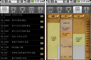 연표에서는 시기별로 주요 역사를 볼 수 있고 2010년의 내용까지 담겨있다. 연표에서 '>'를 선택하면 위키백과와 연동해 더 자세한 내용을 확인할 수 있다. 영토 탭은 원하는 시기를 선택하면 해당 시대의 영토를 보여준다. 역대 왕을 기준으로 정리도 되어있다.