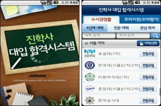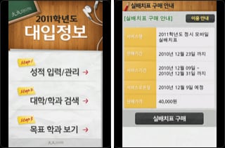 전국 모든 4년제, 2년제 대학들의 입시정보(모집유형 및 경쟁률)를 제공하는 앱이다. 2011 수시정보를 제공하고 모의 지원 기능을 제공하고 있다. 모의 지원 기능을 통해서 현재점수 및 목표점수 입력으로 합격가능 대학을 찾아 볼 수 있다.