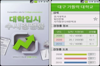 국내 주요 대학의 수시 경쟁률을 한 눈에 보여주는 앱이다. 지역별 주요 대학 분류, 국공립대/사립대/교육대/산업대 별 분류가 되어있어 원하는 대학을 쉽게 찾아 볼 수 있다.