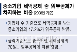 또 중소기업이 혜택을 받는 각종 세액공제제도 중 임투공제가 차지하는 비중은 기업체수로는 47.2%, 감면규모로는 70%를 차지해 임투공제가 중소기업의 감면제도 중에서 상당히 중요한 세금감면 수단이라는 게 중소기업계의 주장이다.