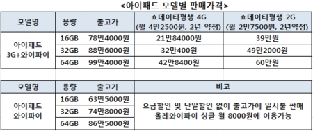 월 4만2500원짜리 '쇼 데이터평생 4G'에 가입할 경우 출고가 78만4000원의 '아이패드 3G+와이파이 16기가바이트(GB) 모델'을 21만8400원에 구입할 수 있다.