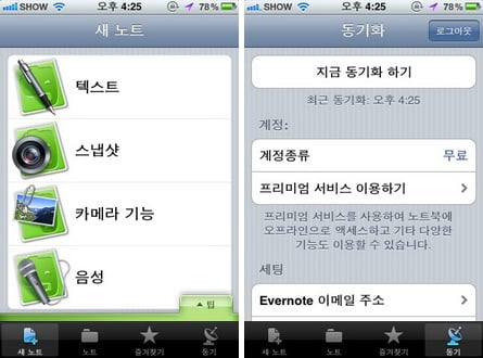 '에버노트' 사용을 위해서는 회원가입이 필요하다. 로그인을 하면 간단한 인터페이스를 가진 메인화면을 볼 수 있다. 새 노트를 선택해 메모를 할 수 있다. 메모를 할 때 상단의 아이콘을 선택해 태그입력, 멀티미디어 파일첨부 등을 할 수 있다. 파일 첨부는 무료버전에서는 그림파일만 첨부가 가능하다. 기타 다른 파일의 첨부를 위해서 프리미엄을 신청해야 한다.