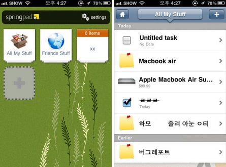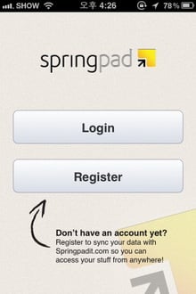 '스프링패드'는 아이폰과 안드로이드를 지원한다. 앞에 소개된 2개의 노트앱처럼 웹과 동기화를 지원 한다. 스프링패드는 한마디로 소개하자면 모든 것을 기록하는 메모장이다