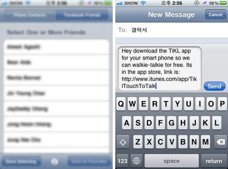 'Contacts'를 선택해서 '티클'을 설치한 친구를 선택해보자. 친구 중 '티클'을 설치한 친구만 보여주는 게 아니라서 일일이 선택을 해줘야 한다. 여러 명을 선택할 수도 있다. 선택했다면 하단의 'Done Seleting'을 누르자.
