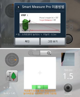 수평계는 실행해 보면 알겠지만 특별한 방식이 있는 것은 아니다. 우리가 흔히 볼 수 있는 형태의 수평계다. 거리/높이 측정기는 증강현실을 응용했다. 높이/거리 측정 말고도 폭 측정기와 면적측정기도 가능하다.