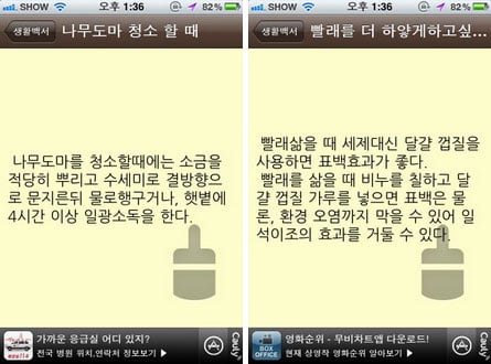 독신남이나 독신녀 혹은 맞벌이로 바쁜 주부들을 위한 앱이 나왔다. 애플 '앱스토어'에서 무료로 내려받을 수 있는 '생활백서-청소편'이 바로 그것이다. 이 앱은 청소에 관한 팁을 100가지 정도로 정리해서 제공한다.