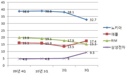 시장조사기관 SA에 따르면 '갤럭시S'의 대박으로 삼성전자는 지난 3분기 750만대의 스마트폰을 판매, 시장점유율 9.3%를 차지했다. 대만 HTC를 제치고 노키아, 애플, 리서치인모션(RIM)에 이어 세계 4위의 스마트폰업체로 단숨에 도약한 것이다.
