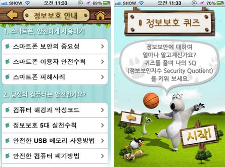 정부가 정보보호에 대한 인식을 제고하기 위해 처음으로 출시한 이 앱은 사이버 보안 일반상식을 비롯해 실생활에서 활용할 수 있는 실천방법을 쉽고 흥미있게 제공하고 있다. 특히 퀴즈에서는 이용자 보안수준을 확인할 수 있다. 또 이 앱을 통해 해킹과 개인정보침해에 대한 24시간 무료상담도 받을 수 있다.