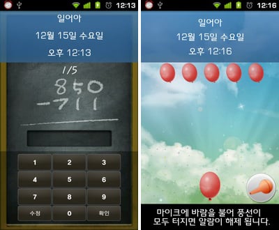 풍선은 마이크에 바람을 불어 풍선을 터트리는 미션이다. 풍선은 5~10개까지 지정이 가능하다. 실제로 불어보니 꽤나 힘든 미션으로 풍선숫자를 적당히 해야 할 듯하다. 흔들기는 단말기를 흔들어 주면 된다. 20~40번까지 지정이 가능한데 한번 흔들어서는 흔들기 숫자가 줄지 않는다. 역시나 잠을 확실히 깨워주는 미션 중에 하나이다.