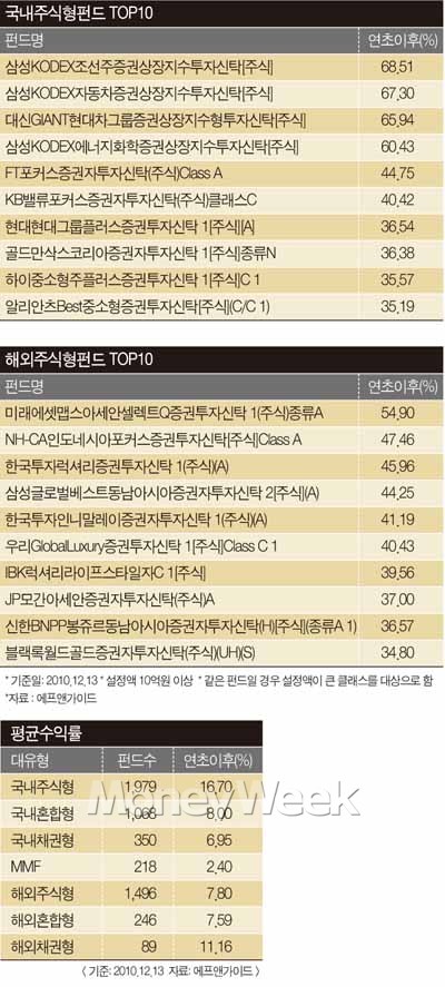 올해 분야별로 강세를 보인 펀드와 섹터는 어떤 것들인지 에프앤가이드의 분석 자료를 토대로 살펴봤다. 지난 12월13일을 기준으로 연초 이후 수익률과 설정액 등에서 최고 성적을 올린 펀드들에 대해 알아보자.