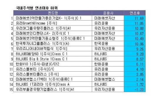 하나UBS자산운용의 하나UBS IT코리아 1[주식]Class A와 하나UBS배당60 1[주식]Class C 1도 각각 1.71%, 9.20%로 저조한 성적을 거뒀다.