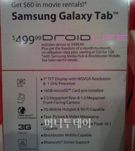 '드로이드라이프'는 이어 "버라이존이 아직 공식입장은 밝히지 않았지만 곧 갤럭시탭을 500달러에 살 수 있게 될 것이다"며 "여기에는 60달러 상당의 영화 다운로드 이용권도 포함될 것"이라고 밝혔다. 특히 이번 할인 판매에는 어떤 약정이나 추가 요금도 없는 것으로 알려졌다.