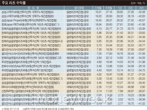 이러한 지역별로는 일본리츠펀드가 지난해 가장 눈부신 수익률을 거뒀다. 지난 4일 기준 일본리츠의 최근 1년 평균 수익률은 28.51%(23일 기준)로 같은 기간 국내주식형펀드 전체 평균인 21.62%를 앞질렀다. 같은 기간 아태리츠펀드는 15.27%, 글로벌리츠펀드는 9.63%의 수익률로 투자 지역별 편차가 크다.