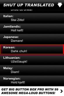 이 버튼을 누르는 것 외에 하나의 기능이 있다. 왼쪽 위의 작은 i아이콘을 누르면 셧업을 다른 나라에서는 뭐라고 하는 알 수 있다. 총 50개국의 언어로 나와 있고 한글도 있다. 한글로는 ‘Dahk chuh!’라고 나와 있다. 애플 앱스토어에서 'Shut up button'으로 검색하면 무료로 내려 받을 수 있다.