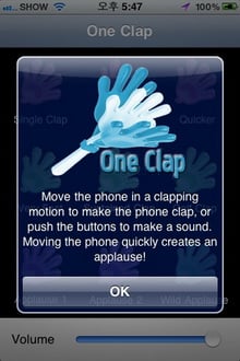 박수소리 중엔 함성도 포함하고 있어서 파티나 즐거운 술자리에서 사용하면 효과가 괜찮다. '원 클랩'은 애플 앱스토어에서 'one clap'으로 검색하면 무료로 설치가 가능하다.