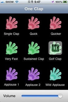 앞서 소개한 ‘셧업 버튼’과 꽤 유사한 형태이다. 화면에서는 박수 형태별로 버튼이 있고 아래쪽에는 박수소리 크기를 조정하는 바가 있다. 총 9개의 박수소리를 가지고 있어 상황에 맞게 선택해주면 한 손으로 박수를 칠 수 있다.