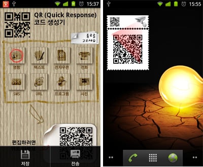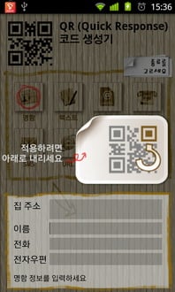 그러나 이젠 앱을 통해 스마트폰에서도 QR코드를 만들어보자. T스토어에서 400원에 내려받을 수 있는 'QR코드 생성기'를 사용하면 된다. 이 앱을 이용하면 개인의 신상에 대한 정보를 담은 QR코드뿐 아니라, 상품에 대한 정보를 담은 QR코드도 생성할 수 있다. 신상을 담은 QR코드에는 이름, 전화번호, 메일주소, 메신저ID 등을 입력하면 된다. 이렇게 생성된 QR코드는 이미지로 저장해두거나 다른 친구와 공유할 수 있다.