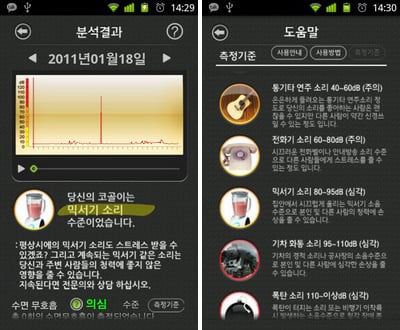 T스토어에서 무료로 내려받을 수 있는 '코골이 분석기'를 한번 사용해보자. 자신이 수면중에 내는 소리를 녹음해서 분석해주는 앱이다. 그래프로 분석해주는 내용을 살펴보면, 자신의 수면상태를 체크할 수 있다. 또 코골이 소리가 몇 데시벨(dB)인지도 알 수 있다. 자신의 코골이 소음이 믹서기 정도의 소음인지, 폭탄 소리인지도 파악할 수 있다. 무호흡증 체크도 할 수 있으니, 무호흡증이 발견된다면 빨리 치료해야 한다.