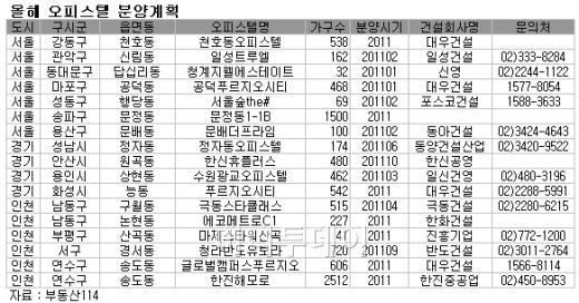올해 선보일 오피스텔은 서울 마포·성동, 분당 정자동 등 대부분 세입자 구하기가 수월한 역세권과 업무시설 밀집지역 주변에 위치해 있어 높은 관심이 예상된다. 서울 문정·천호 일대, 인천 및 경기 주요 도시에서도 비교적 규모가 큰 단지형 오피스텔 물량이 선보일 예정이다.