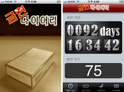 '금연 다이어리'는 '금연도우미'와는 또 다른 기능을 제공하고 있다. 처음 실행시엔 '금연 도우미'처럼 간단한 정보입력을 해야 한다. 담배가격과 하루 흡연량, 흡연을 시작한 날짜, 금연을 시작한 날짜를 입력하자. 모든 정보를 입력하고 금연시작 버튼을 눌러주면 된다.