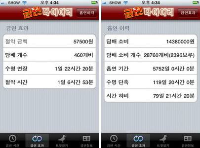 금연시간을 날짜와 시간으로 보여준다. 이 시간이 계속 쌓여 숫자가 늘어갈수록 뿌듯한 기분을 느낄 수 있다. 금연효과 메뉴에서는 금연을 함으로서 생기는 효과를 보여준다. 담뱃값으로 나가지 않은 돈, 금연으로 인한 수명 연장 시간, 담배를 피지 않아서 아껴지는 시간을 알 수 있다.