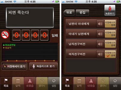 목표에서는 자기 자신에게 보내는 메시지를 적어두어 앱을 실행하면 보이도록 하고 있다. 필살의 의지를 담는 메시지를 적어두자. 그 아래에는 음성메시지 재생 메뉴가 있다. 금연의욕을 더욱 불태울 수 있게 연인의 음성을 녹음해서 들을 수 있는 메뉴다. 연인이 없는 사람을 위해 4가지 상황에 맞게 기본음성 메시지가 포함돼 있다.