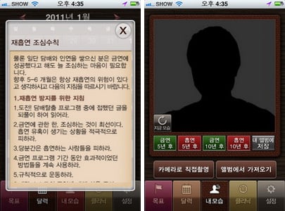 메인 화면 위쪽의 메뉴는 흡연욕구를 몇 번 참았는지 체크도 하고 금연일수와 금연으로 인한 담뱃값을 얼마나 아꼈는지 보여준다.