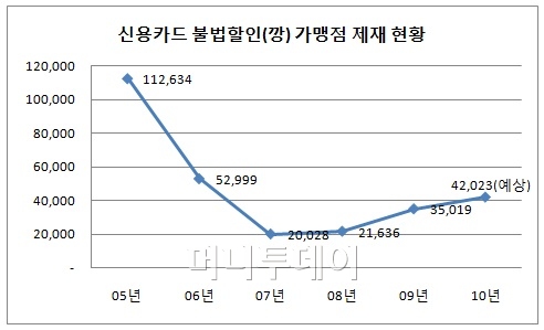 ◇ 2010년 카드깡 전년비 20%정도 증가= 여신금융협회에 따르면 2006년부터 줄어들기 시작했던 신용카드 불법할인(깡) 가맹점 및 회원제재건수는 2008년 금융위기 이후 증가세로 돌아섰다.