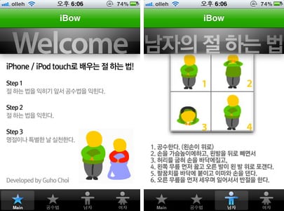 누구나 하는 절. 하지만 가만히 지켜보면 조금씩 다 다르다. 정확하게 절하는 법을 앱을 통해서 배워보자. 애플 앱스토어에서 내려받을 수 있는 'iBow'를 설치하자.