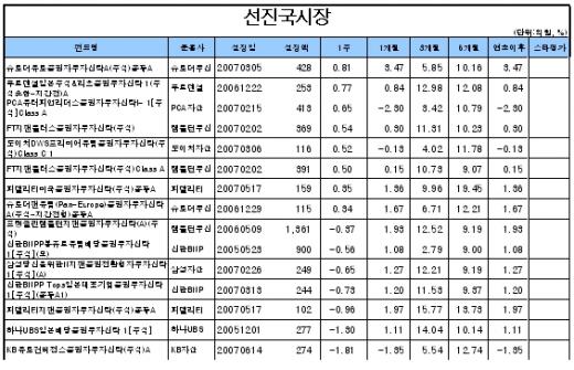 그러나 신흥시장에 투자하는 펀드는 다소 부진했다. 한화카자흐스탄증권투자신탁 1(주식)(A)(0.62%)와 미래에셋맵스코친디아셀렉트Q증권투자신탁 1(주식)(0.14%)만이 플러스 수익률을 올렸을 뿐 우리러시아익스플로러증권투자신탁 1[주식]클래스 A 1, JP모간아세안증권자투자신탁(주식)A 등은 마이너스 수익률을 나타냈다.