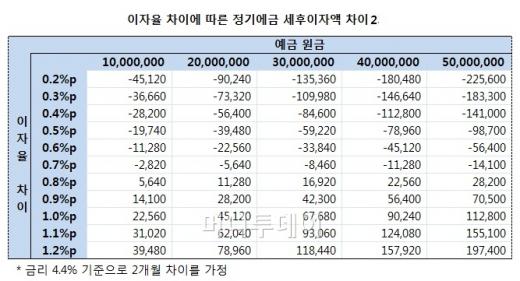 갈아탔을 때 기대할 수 있는 추가 이자액은 △가입기간과 △금리차 △예금액에 따라 달라진다. 특히 금리차를 고려할 때는 세후 금액(세율 15.4%)을 비교해야 정확하다.