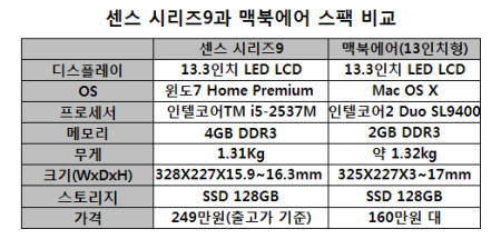 실제로 같은 크기의 맥북에어와 센스9를 비교해보면 둘은 성능과 외형 면에서 큰 차이가 없다. 오히려 메모리(RAM)이나 중앙처리장치(CPU) 등 하드웨어 면에서는 센스9가 더 우수하다.