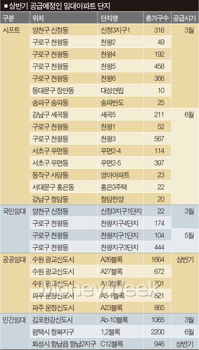 양지영 내집마련정보사 팀장은 “올 상반기 수도권에서 강남 세곡, 우면지구 시프트와 광교신도시 공공임대 등 입지여건이 뛰어난 곳에서 임대아파트가 나올 예정이라 수요자들의 관심이 높을 것으로 보인다”고 말했다.