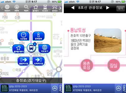 상단의 메뉴를 통해서 앞서 소개된 기능을 이용하는 간단한 사용방법을 가지고 있다. 때문에 지도 보기와 가까운 역 찾기 등을 쉽게 이용할 수 있다. 지하철 정보는 기본으로 수도권지역이 나오지만 설정에서 다른 광역시로의 변경이 가능하다. 메뉴 중 관광정보도 들어가 있어 여행을 하는 사람들은 지하철 역 주변의 관광지를 쉽게 확인 할 수 있다.