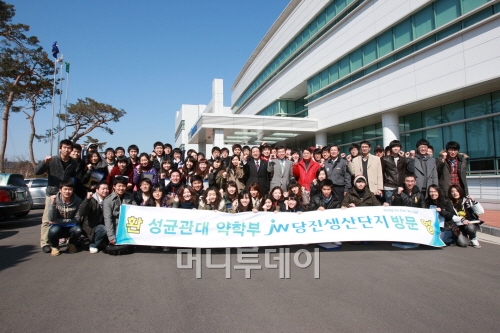 JW홀딩스(4,115원 ▼40 -0.96%)의 자회사인 JW생명과학(대표 박종전, 옛 (주)중외)은 성균관대학교 약학대 신입생을 초청해 JW당진생산단지 견학을 진행했다고 7일 밝혔다.