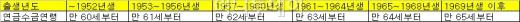 국민연금 수급 개시연령은 출생년도에 따라 달라지는데, 출생년도가 늦을수록 연금 수급연령도 늦어진다. 1952년생까지는 만 60세부터 수급이 가능하며, 1953~1956년생은 만 61세부터 국민연금을 수급할 수 있다. 1969년생 이후일 경우 만 65세부터 국민연금 수령이 가능하다.