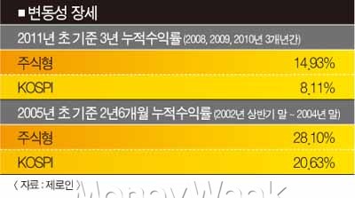 또 다른 변동성 장세는 2008~2010년 3년간이다. 이 기간 코스피는 8.11%의 수익률을 올렸지만 국내주식형펀드는 14.93%로 역시 코스피 수익률을 압도했다.