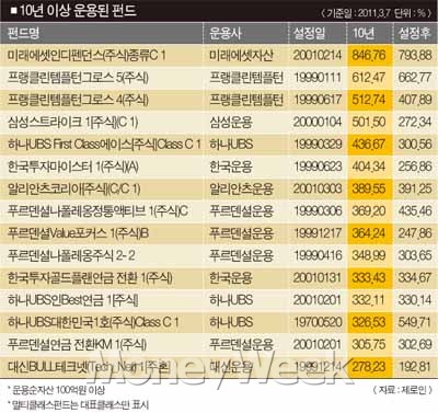 이밖에 '프랭클린템플턴그로스 5(주식)'(설정 후 수익률 662.77%), '프랭클린템플턴그로스 4(주식)'(407.89%), '삼성스트라이크 1[주식](C 1)'(272.34%), '하나UBS First Class에이스[주식]Class C 1'(300.56%), '한국투자마이스터 1(주식)(A)'(256.86%) 등이 10년 이상 운용된 장수펀드들이다.