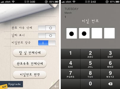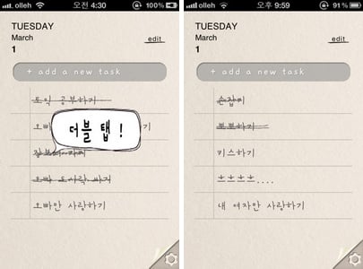완료한 일을 아예 삭제할 때는 ‘edit’를 이용하면 된다. ‘edit’를 선택하면 삭제를 하거나 할 일의 순서를 변경 할 수 있다. 설정에서는 전체삭제나, 자동 삭제, 비밀번호 설정 등을 할 수 있다. 특히 비밀번호 설정은 꼭 필요한 기능이다.