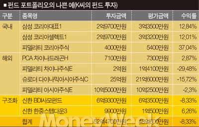 믿고 가입했던 펀드가 손실만 보고 있다면 적당한 선에서 다른 펀드로 과감히 갈아타는 것이 좋다. 펀드 자체뿐 아니라 전체적인 포트폴리오가 잘못 구성된 경우도 종종 있는데 K씨는 이 두가지 모두 해당되는 셈이다.