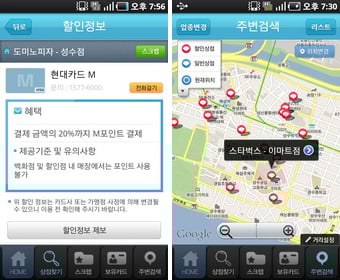 각종 상점 할인 정보를 담고 있는 '온 동네 할인'. 작년출시 이후 현재 등록된 상점이 약 6만9000개, 할인정보 약 940만 건, 카드정보 약 3000건을 담고 있다. 상당히 많은 정보로 아이폰에만 서비스 되던 '온 동네 할인'을 안드로이드에서도 똑같이 이용할 수 있게 됐다.