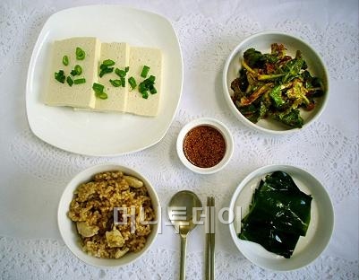 우선 양념장을 집 간장 2티스푼, 고춧가루 3티스푼, 깨소금 약간, 레몬즙 1티스푼, 물1 티스푼으로 만듭니다. 겨울초는 양념장에 버무려 마지막에 참기름을 약간 넣어 무칩니다. 국산 콩두부를 따뜻한 물에 데워서, 다시마는 끓는 물에 데쳐서 양념장과 함께 올립니다. 현미잡곡밥에 콩과 밤을 더하면 영양의 균형과 맛을 더할 수 있습니다.
