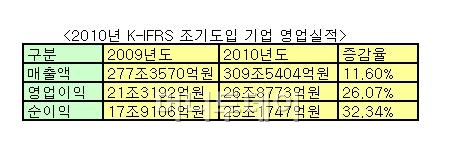 K-IFRS를 지난해 조기 도입한 25개 기업들의 매출액은 309조5404억원으로 전년(277조3570억원) 대비 11.60% 증가했다. 영업이익은 26.07%(21조3192억원→26조8773억원), 순이익은 39.82%(17조9106억원→25조426억원)가 각각 늘었다. 이들 기업의 부채비율은 73.18%로 전년대비 8.93%포인트 감소했다.