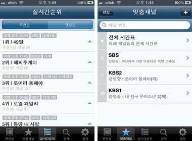 실시간 순위에서는 'TV편성표'를 이용하는 사용자들의 방송 추천으로 인기 순위를 매겨놓은 것이다. 여기서는 어떤 방송이 가장 인기가 좋은지 알 수 있다. 또 방송에 댓글도 달 수 있어 다양한 반응을 확인해 볼 수 있다.