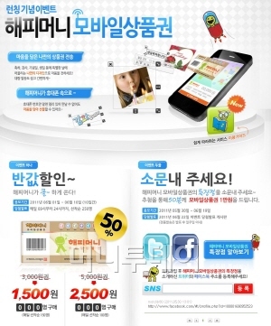 해피머니 홈페이지(www.happymoney.co.kr)를 통해 1일부터 매일 아침9시 선착순 250명에게 해피머니 모바일상품권 50% 할인판매와 트위터, 페이스북에 특장점을 소문내면 모바일상품권 1만원권을 증정하는 이벤트를 진행한다.