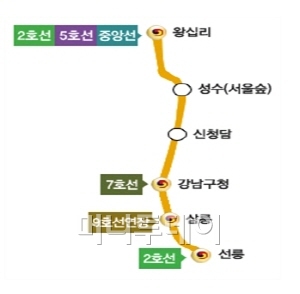 분당선 선릉~왕십리 연장구간은 선릉-삼릉-강남구청-신청담(압구정 갤러리아 사거리)-성수(뚝섬 서울숲)-왕십리 등 6개 역으로 구성된 노선으로 올 연말쯤 개통이 예정되어 있다.