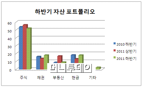 머니투데이가 연초 실시한 '2011 증시 대전망' 설문조사 결과와 비교해보면 가장 눈에 띄는 내용은 주식의 비중이 4.3%포인트 낮아졌다는 것이다. '2011 증시 대전망'에서는 주식의 비중이 56.3%로 역대 최고치를 기록한 바 있다.